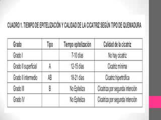 Este documento describe las quemaduras, definidas como la destrucción de los tegumentos y tejidos subyacentes bajo el efecto de un agente térmico, eléctrico, químico o radiactivo. Se clasifican según su profundidad en quemaduras de primer, segundo, tercer o cuarto grado. El documento también cubre la epidemiología, fisiopatología, tratamiento y criterios para la hospitalización de pacientes con quemaduras.