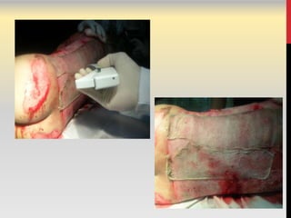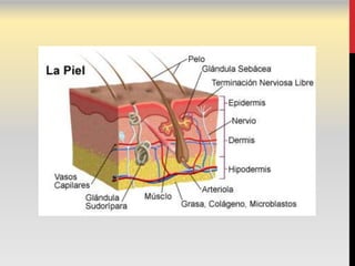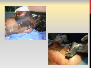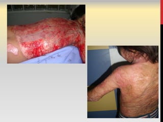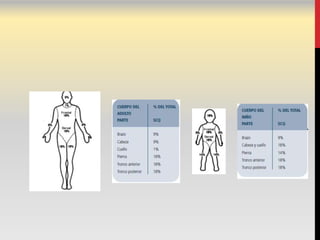 Las quemaduras son un problema de salud pública que pueden causar secuelas graves. Generalmente afectan a niños menores de 15 años, especialmente en la cocina, y son más comunes en grupos socioeconómicos bajos. La evaluación incluye determinar la profundidad, extensión y localización de la lesión, así como el estado de la vía aérea, circulación, diuresis y metabolismo. El tratamiento involucra fluidoterapia, analgesia, nutrición, antibióticos y profilaxis antitetánica según sea necesario
