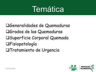 Este documento resume los diferentes tipos de quemaduras según su profundidad y gravedad, incluyendo las características clínicas de cada grado de quemadura y el tratamiento de urgencia requerido. Describe la clasificación de las quemaduras en grados del primero al tercero, el cálculo de la superficie corporal quemada, y el manejo inicial que incluye evaluación, reposición de líquidos, control del dolor, y protección de las heridas.