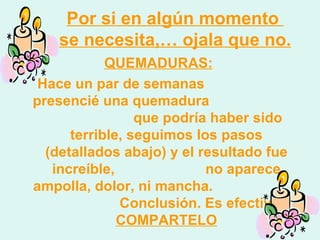 El documento describe los pasos efectivos para tratar una quemadura, incluyendo colocar la parte afectada bajo agua fría para enfriarla y luego aplicar clara de huevo repetidamente. Una amiga se quemó la mano al calentar agua y siguió estos pasos, logrando aliviar el dolor y curarse sin cicatrices en sólo 10 días, debido al colágeno en la clara de huevo.