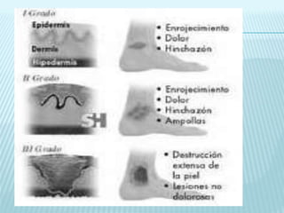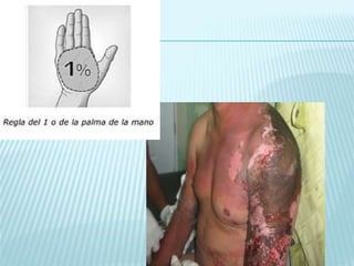 Este documento trata sobre las quemaduras. Define las quemaduras, su epidemiología, mecanismos de producción, clasificación, profundidad, fisiopatología, tratamiento inicial y cuidados de la herida. Describe los cambios locales y sistémicos causados por las quemaduras, así como la importancia de la valoración inicial y la fluidoterapia para prevenir el choque.
