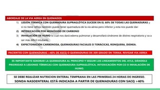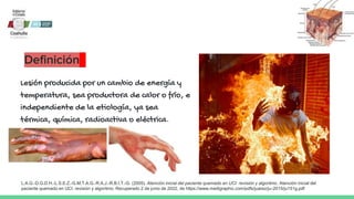 Este documento trata sobre las definiciones, tipos, diagnóstico y tratamiento de quemaduras. Define quemaduras térmicas, químicas y eléctricas, y describe las características de cada tipo. Explica cómo clasificar las quemaduras por gravedad y la regla de los 9 de Wallace para determinar el porcentaje de superficie corporal afectada. Resalta la importancia del tratamiento temprano, incluyendo lavado, desbridamiento y prevención de infecciones.