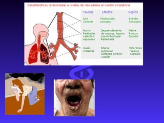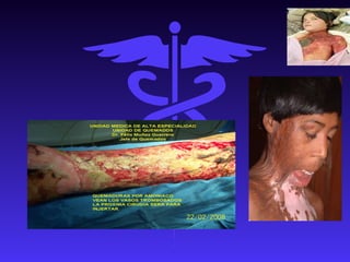 Las quemaduras son lesiones celulares causadas por la transferencia de energía térmica, eléctrica, radiante o química. Existen tres tipos principales de quemaduras según la profundidad: tipo A, que afecta la epidermis; tipo AB, que afecta la epidermis y dermis superficial; y tipo B, que afecta toda la dermis y capas subcutáneas. El tratamiento pre-hospitalario incluye aplicar agua fría, cubrir la zona, evaluar la extensión de la quemadura y transferir al hospital a