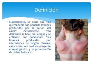 Este documento trata sobre quemaduras en niños. Resume que las quemaduras son una causa importante de morbilidad y mortalidad en niños, especialmente entre las edades de 2 y 4 años. Generalmente ocurren en el hogar por agentes térmicos. Explica los diferentes tipos de quemaduras, la clasificación, evaluación, tratamiento inicial, cuidados como la reposición de líquidos, y tratamientos quirúrgicos para quemaduras graves.