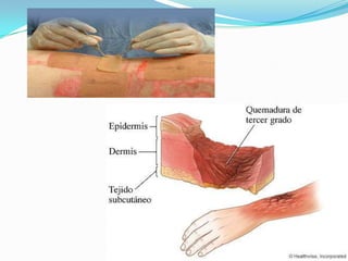 Existen cuatro tipos de quemaduras: térmicas, químicas, eléctricas y solares. Las quemaduras se clasifican en tres grados dependiendo de la profundidad del daño en la piel: quemaduras de primer grado afectan solo la epidermis, las de segundo grado afectan también la dermis y las de tercer grado destruyen toda la piel. Para quemaduras menores se debe enfriar la zona con agua y aplicar un vendaje limpio, mientras que para quemaduras mayores es necesario llamar a emerg