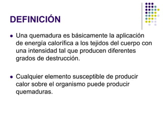 Este documento describe las quemaduras, incluyendo su definición, clasificación, agentes causantes, profundidad, extensión e implicaciones. Las quemaduras se clasifican por agente causante, profundidad y porcentaje de superficie corporal afectada. El tratamiento prehospitalario incluye retirar al paciente de la causa, estabilizarlo y valorar signos de inhalación de humos.