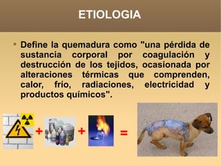 Este documento describe las quemaduras, incluyendo su etiología, tipos, causas, grados, posibles complicaciones, diagnóstico y tratamiento. Las quemaduras se definen como una pérdida de sustancia corporal por coagulación y destrucción de los tejidos causada por alteraciones térmicas. Se clasifican en cuatro grados dependiendo de la profundidad del daño tisular. El tratamiento varía desde la limpieza y hidratación para quemaduras leves hasta compresas frías y vendajes protectores para quemaduras grandes.