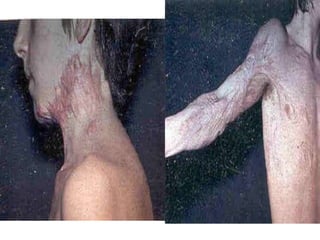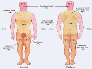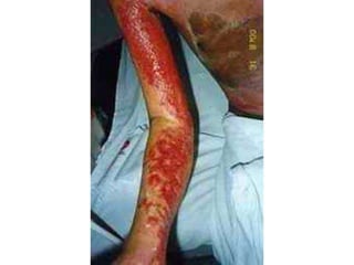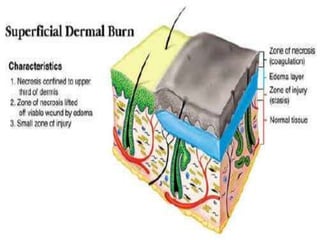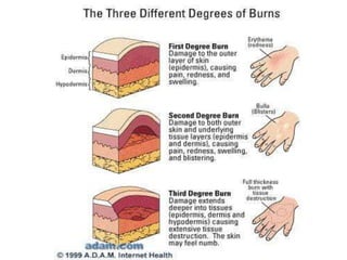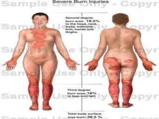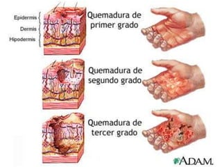2) Las quemaduras más comunes son las escaldaduras en niños menores de 6 años, y las quemaduras ocupacionales en personas entre 25-35 años. Los factores de riesgo incluyen el calor, la electricidad y sustancias químicas cáusticas.
