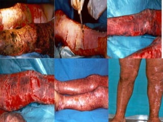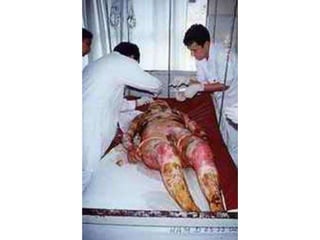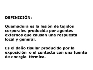 1) Las quemaduras son lesiones de los tejidos corporales producidas por agentes externos que causan una respuesta local y general. Cada año 1.1 millones de personas sufren quemaduras graves y 4,500 mueren a causa de ellas.