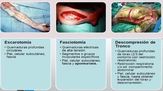 El documento analiza el manejo integral de pacientes con quemaduras, incluyendo tipos, grados y la intervención de enfermería necesaria. Detalla la clasificación de las quemaduras, su impacto en la salud del paciente y las técnicas de tratamiento, así como la importancia de la atención psicológica en la recuperación. Además, se abordan intervenciones específicas para el cuidado de quemaduras según su gravedad y los cuidados postoperatorios relacionados con injertos de piel.