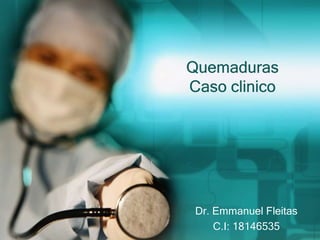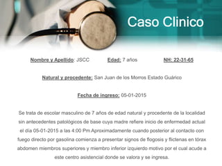 Este documento presenta el caso clínico de un niño de 7 años que sufrió quemaduras por contacto directo con fuego y gasolina. Fue ingresado al hospital y tratado por quemaduras de primer y segundo grado en el tórax, abdomen, brazos y pierna. Recibió antibióticos, analgésicos y curas quirúrgicas. Presentó fiebre que mejoró con el cambio de antibióticos. Fue referido a una unidad de quemados para injertos debido a la gravedad de sus lesiones.