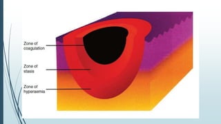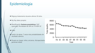 Este documento describe las quemaduras desde una perspectiva clínica. Define las quemaduras como lesiones tisulares de origen térmico y discute la epidemiología, etiología, fisiopatología, manifestaciones sistémicas, clasificación, evaluación y manejo de las quemaduras, incluida la reanimación con fluidos. El documento provee una visión general integral del tema de las quemaduras.