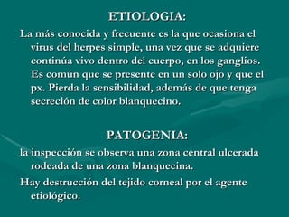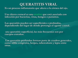 La queratitis viral es una inflamación de la córnea del ojo causada por virus como el herpes simple. Puede causar úlceras en la córnea y dolor, y depende de dónde provenga el agente causal puede ser superficial o profunda. El edema cistoide es una acumulación de líquido en las capas internas de la retina que puede causar disminución de la agudeza visual y la presencia de un punto amarillento en la fóvea. El tratamiento hiperbárico se usa para destruir el agente causante y
