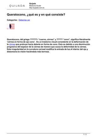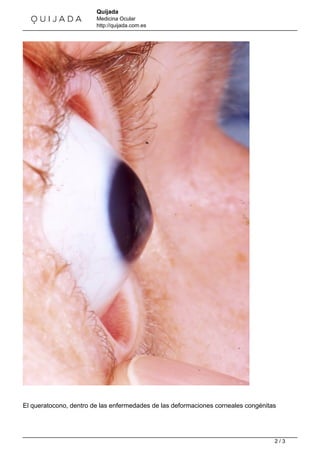 El queratocono es una deformación progresiva de la córnea que adopta una forma cónica, debilitando y adelgazando la córnea. Esto distorsiona la visión y causa visión borrosa. El queratocono es la deformación corneal más común y suele manifestarse a una edad temprana, aunque no es hereditaria. Los síntomas incluyen visión borrosa, distorsión visual y deterioro de la visión. El tratamiento depende de la gravedad y puede incluir gafas, lentillas, implantes corneales o
