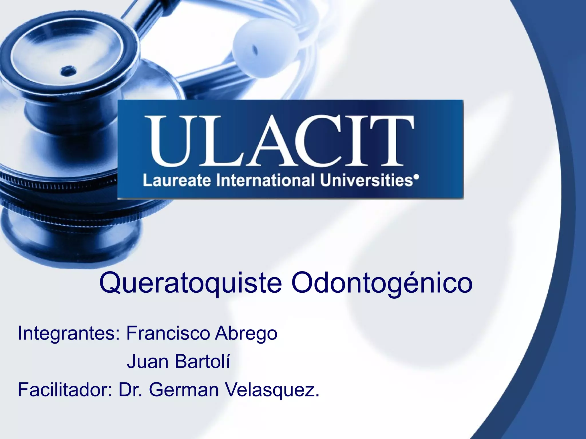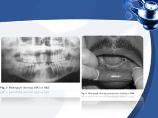 El documento estudia la prevalencia, tratamiento y recurrencia del queratoquiste odontogénico en India central, un quiste agresivo con alta tasa de recurrencia. Se analizaron 2900 pacientes, diagnosticando 49 casos, predominantemente en hombres y en la mandíbula, con un enfoque en tratamientos como enucleación y resección segmentada. La tasa de recurrencia observada fue relativamente baja en comparación con otros estudios, sugiriendo la necesidad de seguimiento a largo plazo.