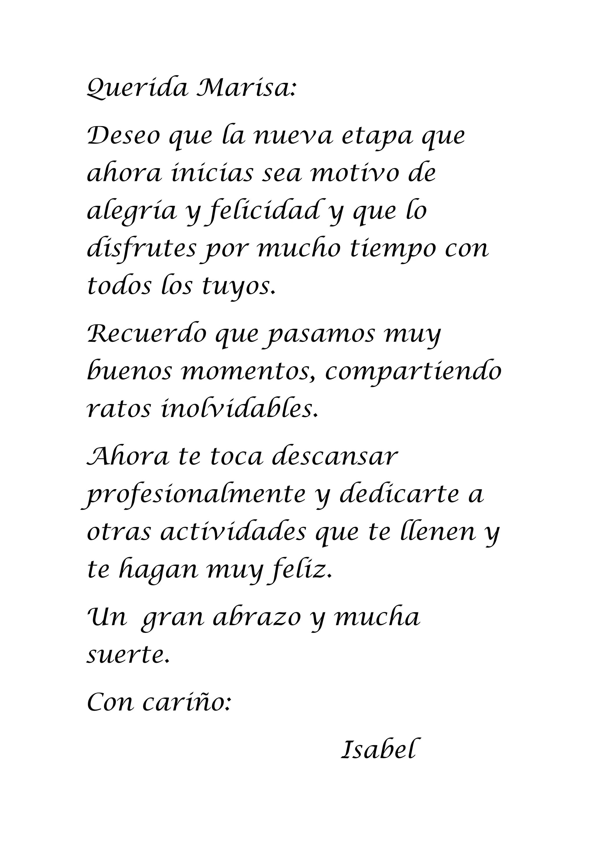 Isabel le desea a Marisa lo mejor en su nueva etapa, recordando los buenos momentos que compartieron. Le desea que disfrute de su descanso profesional dedicándose a actividades que la llenen y hagan feliz.