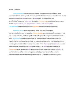 El autor aconseja a Juan Carlos sobre la diferencia entre comprar una casa o un apartamento. Señala que ambas opciones tienen áreas comunes como sala, cocina y baño, pero las casas suelen tener más espacio y un jardín, mientras que los apartamentos son más pequeños y a veces más asequibles. El autor recomienda que Juan Carlos considere si prefiere vivir solo o en familia, en la ciudad o el campo, y cuánto espacio necesita para tomar una buena decisión.