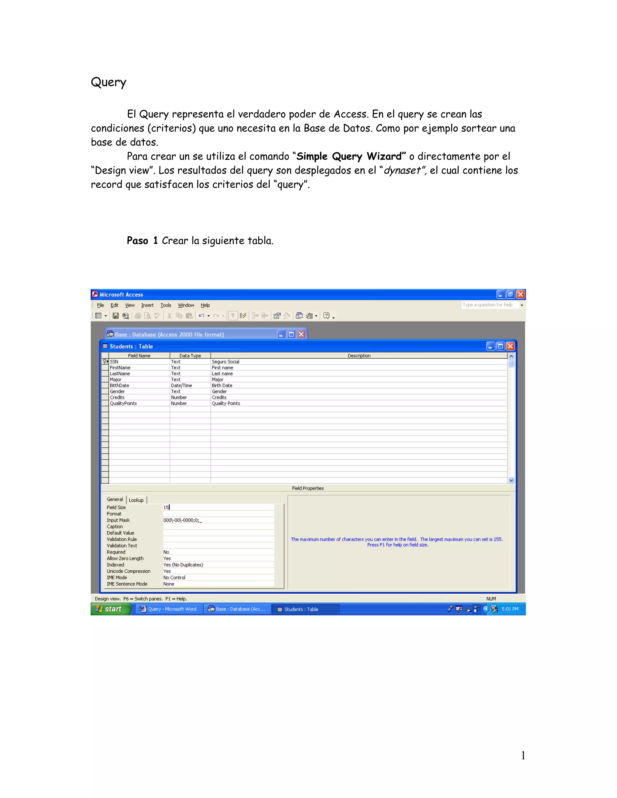 Este documento describe los pasos para crear una base de datos en Access y desarrollar la estructura de una tabla. Explica cómo crear una nueva base de datos, agregar una tabla vacía y definir los campos y sus tipos de datos. También cubre cómo designar un campo como clave primaria para que contenga valores únicos que identifiquen cada registro.