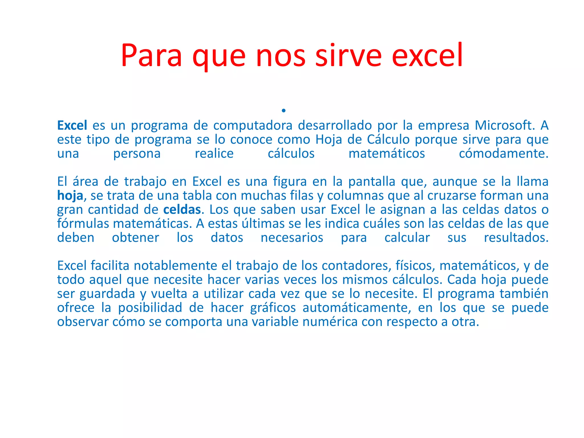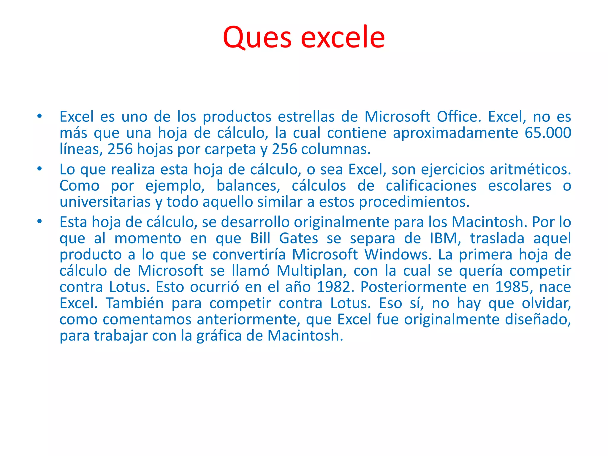 Excel es una hoja de cálculo desarrollada originalmente para Macintosh que ahora es parte de Microsoft Office. Permite realizar cálculos aritméticos como balances y calificaciones en celdas, y contiene herramientas como gráficos automáticos que facilitan análisis matemáticos. Excel simplifica tareas financieras y científicas al permitir ingresar y modificar datos, copiar y borrar celdas, y guardar hojas para su reutilización.