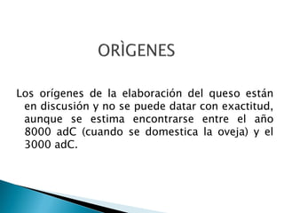 El documento trata sobre el queso. Explica que los orígenes del queso se remontan entre el 8000 a.C. y el 3000 a.C. y que existen muchos tipos de queso clasificados por diferentes características como el origen de la leche, contenido de grasa o textura. También describe el proceso de elaboración del queso, que implica la coagulación de la leche, prensado, salado y maduración.