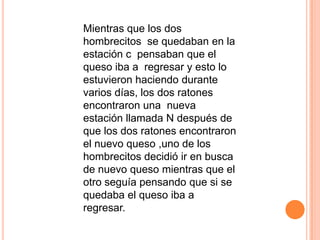 Dos ratones y dos hombrecitos buscaban queso diariamente en un laberinto. Encontraron queso en la Estación C, pero los ratones notaron que los hombrecitos se lo comían rápido. Los ratones encontraron una nueva estación llamada N mientras que uno de los hombrecitos también la encontró pero el otro se quedó esperando en C. Un hombrecito puso letreros en las paredes para no caminar en círculos y encontrar nuevos caminos.