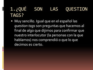 Este documento explica las reglas para usar preguntas de confirmación o "question tags" en inglés. Explica que se usan verbos auxiliares al final de oraciones para confirmar que el interlocutor comprende. Detalla las reglas de usar tags negativos después de oraciones afirmativas y positivos después de negativas. Además, cubre el uso de tags con diferentes tiempos verbales como presente, pasado, y con verbos como "have", "will" y "should".