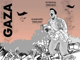 El documento proporciona información sobre la Franja de Gaza. Se ha habitado durante más de 3,000 años y ha sido un enclave estratégico en el Mediterráneo. Actualmente está controlada por Hamás desde 2007. Hamás es la mayor organización terrorista islámica en la región y combina la lucha armada con programas de bienestar social. El documento también resume brevemente la historia del conflicto Israel-Palestina y los motivos de ambos lados.