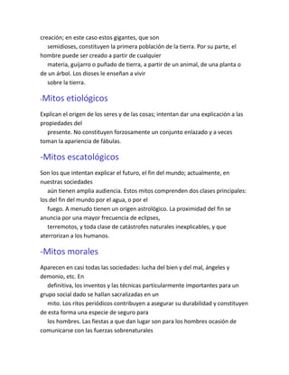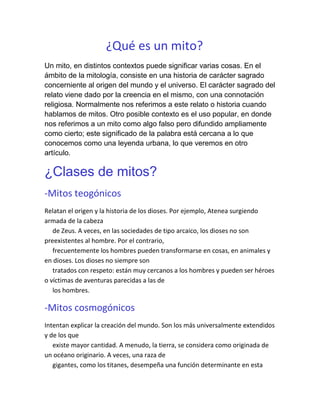 El documento define los mitos como historias sagradas relacionadas con el origen del mundo y el universo que son creídas de forma religiosa. Explica varios tipos de mitos como los teogónicos sobre el origen de los dioses, los cosmogónicos sobre la creación del mundo, los etiológicos sobre el origen de seres y cosas, los escatológicos sobre el fin del mundo y los morales sobre la lucha del bien y el mal. También define las leyendas como relatos de hechos humanos transmitidos de generación en generación que se