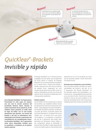El documento describe el nuevo Bracket QuicKlear® de segunda generación de Forestadent. Tiene una superficie pulida mate que lo hace menos visible y más discreto. Los bordes redondeados del bracket y la ranura reducen la fricción y mejoran la comodidad. Ahora está disponible de 3 a 3 para la mandíbula inferior, completando así el aspecto estético general. La combinación de brackets QuicKlear® y BioQuick® ofrece estética, precisión y fuerzas reducidas.