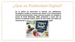 La publicidad digital se refiere al uso de Internet, plataformas y recursos digitales para ofrecer anuncios promocionales a los consumidores. Algunas características clave son la hipersegmentación de audiencias, comunicación bidireccional, medición de resultados, bajo costo, rapidez, actualización constante de información y flexibilidad en formatos. Entre las ventajas se encuentran costos más bajos, cobertura las 24 horas, inmediatez, segmentación, uso de redes sociales y medición de resultados.