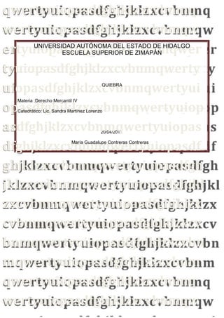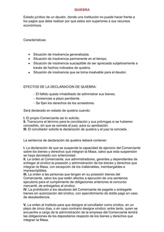 Este documento trata sobre la quiebra como estado jurídico de un deudor que no puede hacer frente a sus pagos debido a que sus deudas superan sus recursos económicos. Presenta las características de la quiebra, sus efectos y los criterios para ser declarado en quiebra. Incluye bibliografía sobre la quiebra en la ley de concursos mercantiles.