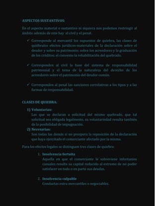 Este documento resume los aspectos sustantivos de la quiebra, incluyendo las clases de quiebra (voluntarias y necesarias), los efectos de la declaración de quiebra sobre el deudor, su patrimonio y los acreedores, y distingue entre insolvencia fortuita, culpable y fraudulenta. También explica los efectos personales, patrimoniales y registrales de la declaración de quiebra sobre el deudor, así como los efectos procesales y materiales sobre los acreedores.