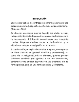 Este documento define quién es Dios según diferentes religiones y creencias. Explica que Dios es considerado la deidad suprema en el cristianismo, judaísmo e islamismo. Según la religión cristiana, Dios es una entidad compuesta de tres personas - Dios Padre, Dios Hijo (Jesucristo) y Dios Espíritu Santo. El documento también discute las pruebas de la existencia de Dios y aquellos que no creen en Él.