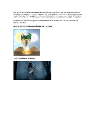 Este documento resume la figura del héroe y su viaje épico según el psicoanalista Joseph Campbell. Describe las diferentes etapas del viaje del héroe: la llamada a la aventura, el cruce del primer umbral, las pruebas, el encuentro con la diosa, la apoteosis, el regreso y el cruce del umbral final. También contrasta los conceptos de mito y leyenda, señalando que los mitos transcurren en un pasado atemporal con elementos sobrenaturales, mientras que las leyendas son historias reales transmitidas oralmente.