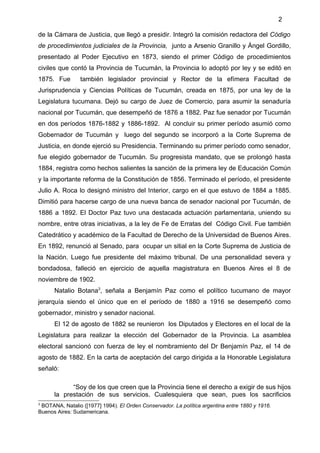 Benjamín Paz fue un político y jurista argentino nacido en Tucumán en 1836. Ocupó cargos como senador, gobernador de Tucumán, ministro del Interior y presidente de la Corte Suprema. Tuvo una destacada carrera política a nivel provincial y nacional, impulsando leyes de educación y reformas constitucionales. Fue considerado uno de los políticos tucumanos más importantes de su época.
