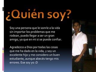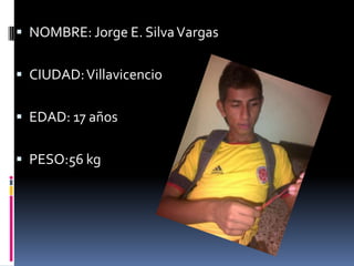 Jorge E. SilvaVargas es un joven de 17 años y 56 kg de Villavicencio. A pesar de los problemas, le sonríe a la vida y puede ser un gran amigo en quien se puede confiar. Agradece a Dios por lo que tiene y se considera un buen hijo y estudiante, aunque a veces comete errores.