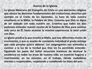 La Iglesia Mexicana del Evangelio de Cristo sigue las enseñanzas de la Biblia y cree en Dios, Jesucristo, y el Espíritu Santo. La iglesia enseña sobre el crecimiento espiritual hacia una mayor unión con Dios y anima a los congregantes a vivir de acuerdo con la verdad bíblica. La iglesia da la bienvenida a todos y predica sobre el camino de Jesucristo y su crucifixión.