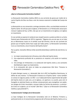 La Renovación Carismática Católica (RCC) es una corriente de gracia mediante la cual el Espíritu Santo lleva a los creyentes a vivir de manera vivencial el Cuerpo de Cristo. La RCC involucra una conversión constante a Dios y una docilidad creciente al Espíritu Santo. Más que un movimiento, la RCC es la Iglesia en movimiento renovada por el Espíritu Santo. La RCC se centra en un mejor conocimiento de la Persona y Obra del Espíritu Santo y en una