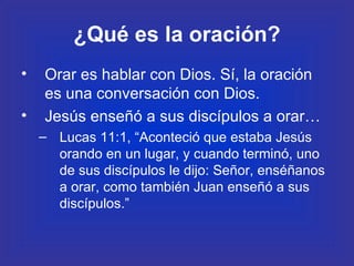 El documento habla sobre la oración y cómo debe practicarse. Explica que la oración es una conversación con Dios y que Jesús enseñó a sus discípulos a orar a través del Padre Nuestro. También menciona dos tipos comunes de oración: la intercesión y la petición. Además, señala que aunque Dios no siempre responde como esperamos, debemos orar de acuerdo a su voluntad y perseverar en la oración.