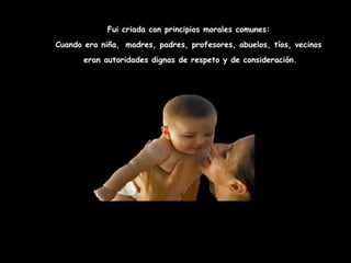 El autor expresa tristeza por los valores que se han perdido en la sociedad actual como el respeto a las autoridades y entre las personas. Antes había más confianza entre los vecinos y en las instituciones. Hoy hay más miedo y cada persona vive encerrada en su propio mundo. El autor quiere recuperar valores como la honestidad, la solidaridad y vivir de forma más sencilla, enfocada en el ser en lugar del tener.