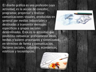 El documento habla sobre la carrera de diseño gráfico. Explica que el diseño gráfico se encarga de comunicar ideas de manera visual mediante diferentes medios. Luego, detalla las asignaturas de las carreras de Bellas Artes y Diseño Gráfico, así como las salidas laborales en campos como la enseñanza, pintura, artes gráficas y diseño industrial. Finalmente, brinda más detalles sobre el plan de estudios y asignaturas de un ciclo superior de Diseño Gráfico.