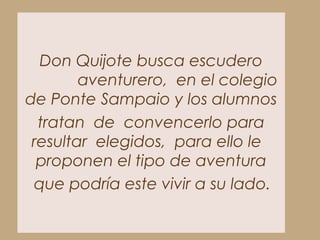 Don Quijote busca un escudero en un colegio. Varios alumnos le proponen sus habilidades para ser elegidos, incluyendo bailar hip hop, patinar, escalar, adiestrar perros, saltar muros, jugar fútbol, lanzar piedras, tocar la guitarra, conocer lugares y gente, y tener buen trato con los animales. Don Quijote debe elegir quién le acompañará en sus aventuras.