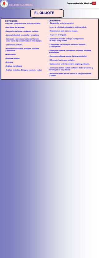 El documento describe una actividad educativa sobre la novela "El Quijote" dirigida a alumnos de 4o de primaria. La actividad incluye diapositivas sobre la historia y aventuras de Don Quijote, ejercicios de gramática, comprensión lectora y lúdicas como karaoke y crucigramas. Los alumnos trabajarán de forma individual y cooperativa resolviendo ejercicios en su cuaderno y en la pizarra. Los contenidos incluyen lectura, gramática, análisis sintáctico y morfológ