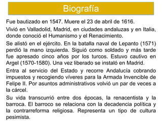 Este documento presenta una biografía y análisis de la obra de Miguel de Cervantes. Destaca que escribió la novela El Quijote, publicada en dos partes en 1605 y 1615, que parodia los libros de caballerías y es considerada una de las obras maestras de la literatura universal. También resalta los personajes principales, Don Quijote, un hidalgo que cree ser caballero andante, y su escudero Sancho Panza.