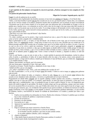 El documento presenta un fragmento del capítulo 45 de la segunda parte de 'Don Quijote' de Miguel de Cervantes, donde Sancho Panza actúa como gobernador y resuelve un pleito entre un labrador y un sastre. Sancho demuestra ingenio al descubrir que los diez escudos en disputa están escondidos en un báculo, lo que deja a los presentes admirados de su perspicacia. A través de una serie de interacciones cómicas, se plantea la naturaleza del gobierno y el sentido común de Sancho Panza.