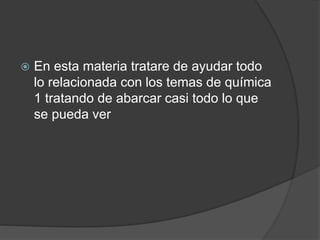 El documento trata sobre varios temas fundamentales de química como los modelos atómicos a través de la historia (Demócrito, Thomson, Rutherford, Bohr, Sommerfield), la diferencia entre masa, materia y energía, y los estados de la materia. También explica la diferencia entre elementos, compuestos y mezclas, describiendo elementos como sustancias puras e indivisibles, compuestos como sustancias formadas por varios elementos que no pueden separarse, y mezclas como una combinación de sustancias que mantienen sus propiedades