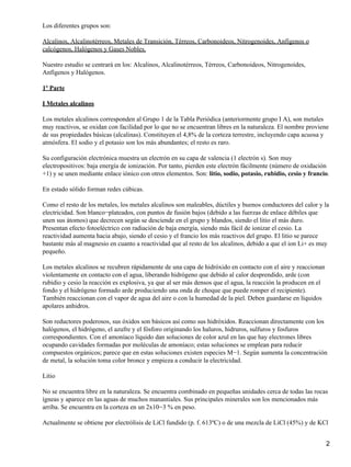 Este documento describe las propiedades de varias familias de elementos químicos, incluyendo los metales alcalinos, alcalinotérreos, térreos, carbonoideos, nitrogenoides, anfígenos y halógenos. Explica que estos elementos se agrupan en columnas de la tabla periódica debido a similitudes en sus propiedades electrónicas. Luego procede a describir las propiedades químicas características de cada uno de estos grupos y algunos usos comunes de sus elementos.
