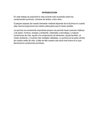Este documento presenta un plan de recuperación química que incluye información sobre nomenclatura sistemática y de Stock, fórmulas químicas de óxidos, hidróxidos y ácidos. También incluye noticias sobre temas químicos vistos durante el período y concluye que la química es fundamental para la vida dado que los seres humanos y alimentos contienen elementos químicos necesarios.