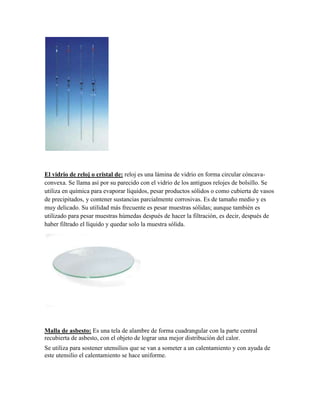 El documento describe diversos materiales de laboratorio esenciales, incluyendo tubos de ensayo, pipetas, vidrio de reloj, malla de asbesto, mortero y mazo, gotero, pinza de Mohr, agitador magnético, tapón, Erlenmeyer, espátula, crisol, embudo Büchner, balanza granataria, triangulo, tubos de ensayo, nuez, capsula de porcelana, matraz volumétrico, botella lavadora, pinza para tubo de ensayo, tenaza, perilla de g