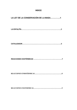 El documento presenta un ensayo de investigación sobre química realizado por un estudiante de ingeniería en sistemas computacionales. El ensayo incluye secciones sobre la ley de conservación de la masa, la entalpía, los catalizadores y las reacciones exotérmicas y endotérmicas. El documento proporciona detalles sobre el estudiante, la carrera, el semestre, la asignatura y la fecha en que se realizó el ensayo.